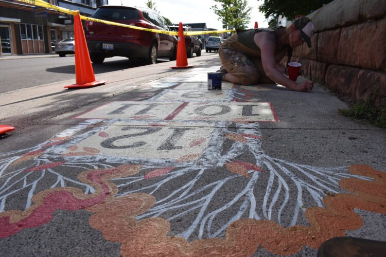 Hancock artist Rebecca Paavo puts the finishing touches on a hopscotch piece on the sidewalk in front of Quincy Green Thursday night. The theme, Summertime Hopping into Autumn, will be complemented by a piece on the other side of Quincy Green depicting Winter Hopping into Spring. Paavo had put ...