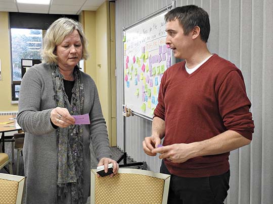 (Garrett Neese/Daily Mining Gazette) Mary Haber, director of Michigan Technological University’s IDEA Lab, talks with social sciences assistant professor Mark Rouleau at IDEA Lab’s first open house Wednesday.
