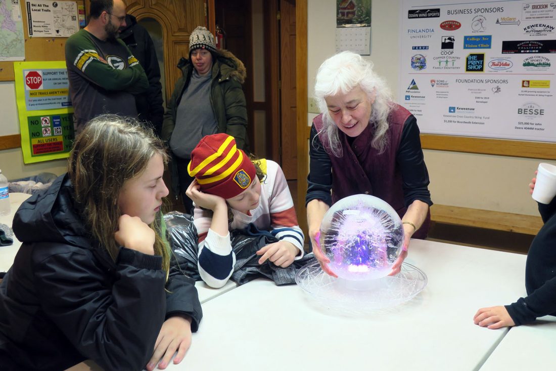 - Provided by John Diebel Jeanne Diebel explains the creation of a lit ice-orb she made to a couple of young people.