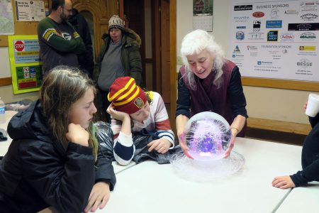 Provided by John Diebel Jeanne Diebel explains the creation of a lit ice-orb she made to a couple of young people.