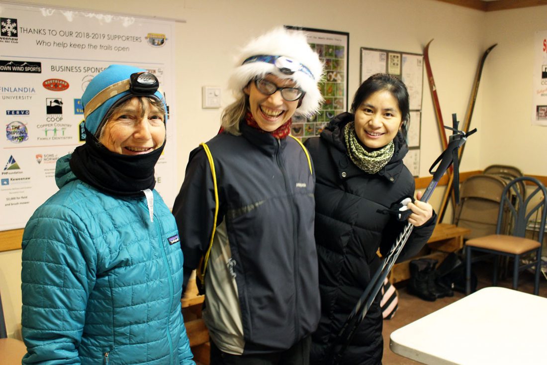 Joshua Vissers/Daily Mining Gazette (From feft)Judy Foster, Fran Grossman and Shen Xuehua (Sherry) stopped to chat while getting ready for the trail in the ski chalet.