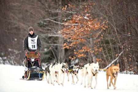 - (Photo provided by Evan Smith) MTU Mushing Club member Steven Beauprey finishes with his team in eighth place in the 40-mile Tahquamenon Country Sled Dog Race. The club is beginning its second year of racing.