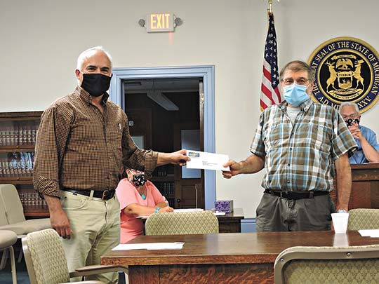 Graham Jaehnig/Daily Mining Gazette Keweenaw Outdoor Recreation Coalition Executive Director, Jim Vivian III (left), presented Keweenaw County Board Chairman Don Piche a check donation of just under $6,000 to assist with the costs incurred in the Gratiot River Park project. The check was presented during the July regular board.