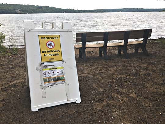 Garrett Neese/Daily Mining Gazette A sign with a recreational health advisory warns prospective swimmers away from Prince’s Point on Monday due to potentially harmful algal blooms. The Western Upper Peninsula Health Department lifted the advisory Thursday after test results showed the blooms tested negative for toxins.