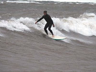 - Garrett Neese/Daily Mining Gazette A surfer tests the waves along the McLain State Park shoreline Thursday.