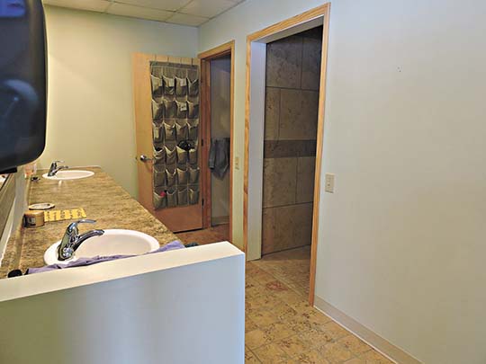The facilities includes a private toilet, private shower and closet and changing room, while the laundry room, is equipped with a washer and dryer, donated by Hyrkas Construction, cabinets and doors, donated by McGann’s, and tile and grout donated by Kirkish Furniture. The entire setup was designed to look as though it is located in a modern, upscale home.