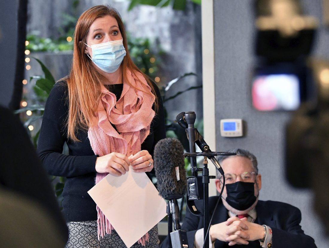 Wayne County Board of Canvassers member Monica Palmer holds a press conference at the law offices of Michael Schwartz, Thursday, Dec. 24, 2020 in Farmington Hills, Mich. Federal prosecutors on Wednesday, Dec. 23, filed charges against Katelyn Jones of Epping, N.H.,, who is accused of texting threats to Palmer following the presidential election and sending photos of a bloody mutilated female body. Jones was charged with threatening violence through interstate commerce following an FBI investigation. (Robin Buckson/Detroit News via AP)