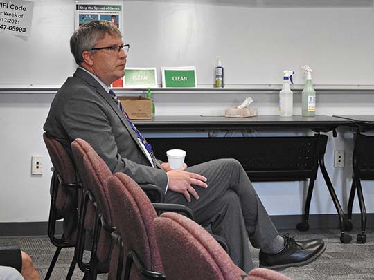 Garrett Neese/Daily Mining Gazette James Rautiola, who the Copper Country Intermediate School District Board voted to hire as the district’s next superintendent earlier this month, listens during a committee meeting prior to the regular board meeting Tuesday.