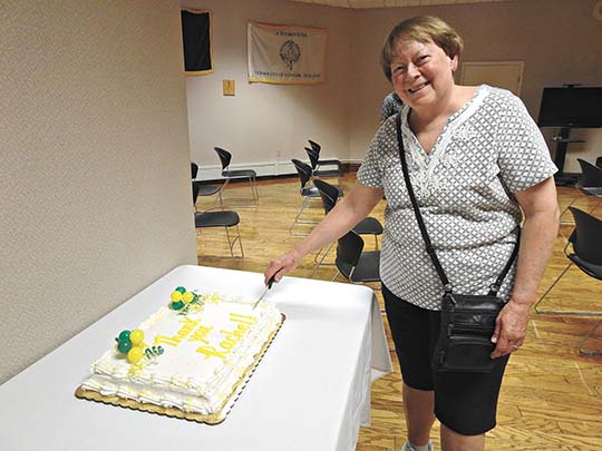 Garrett Neese/Daily Mining Gazette Rachel Lankton handles ceremonial cake-cutting duties at a celebration in her honor at the Houghton City Council meeting. Lankton served on the Houghton City Council for 16 years, leaving in December 2020 after not seeking re-election.