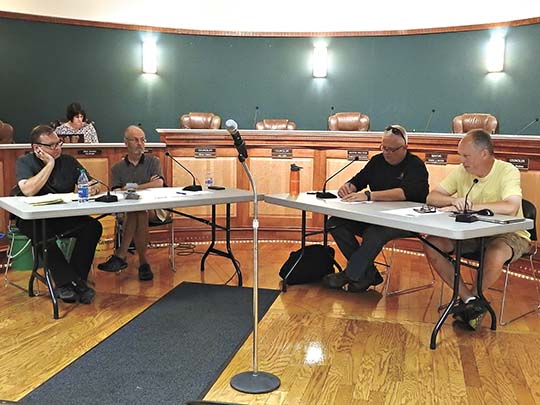 Garrett Neese/Daily Mining Gazette Houghton Parking Deck Subcommittee members Eric Waara, Tom Merz, Dan Liebau and Mike Needham talk during Monday’s meeting. The subcommittee backed the removal of the parking deck after considering a range of options.