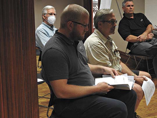 Garrett Neese/Daily Mining Gazette Lars Hyrkas and Derek Bradway answer questions form the Houghton Planning Commission regarding a planned campground along Canal Road near Cole’s Creek. The commission approved the grading plan for the site.