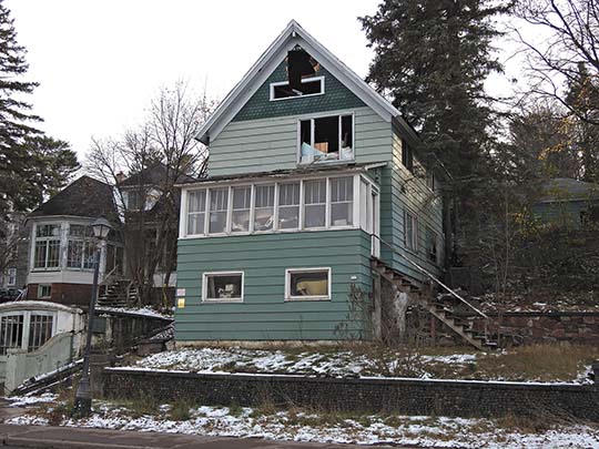 Garrett Neese/Daily Mining Gazette The College Avenue building gutted by a fire in March is seen Friday. The Houghton City Council voted Wednesday to allow the city to tear the building down after 30 days if the owner does not provide a plan to repair or demolish the building.