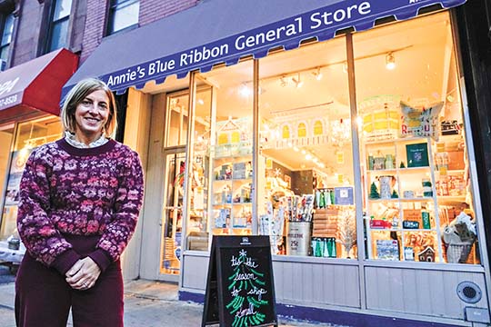 Ann Cantrell, owner of Annie's Blue Ribbon General Store poses for a photo outside her store, Wednesday, Dec. 15, 2021, in the Brooklyn borough of New York. Cantrell has owned the store in Brooklyn for 14 years. She said social media promotions to reach out to customers during the pandemic are still boosting sales, including a video of new items each Friday. (AP Photo/Mary Altaffer)
