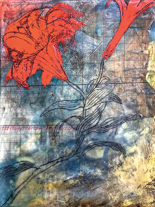 There is an interesting play with light and dark; whereas many of the pieces have an ascending darkness to them, others are illuminated from the back. Lilies blossom throughout this exhibit; the lilies and the light represent the hope that natural regeneration brings to a world where, as her mentor Jacques Ellul has said, the worship of technology leads us away from the wisdom of our ancestors who were intimately connected to the natural world. One of my favorites from the show is a series of eight smaller pieces called “Lily Among Thorns” the background is a collage of dress-making patterns and striped tissue, and each has a lily in pigmented wax. There is darkness but also light in each piece, and though available for sale as individual works, the display looks really nice as a set.