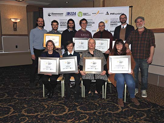 Garrett Neese/Daily Mining Gazette Winners from the Keweenaw Community Sparkplug Awards pose for a group photo after Thursday night’s awards ceremony. Top row, from left: Austin Gongos and Nathan Ackerman of innovation/transformation winners Chicken Tramper Ultralight Gear; Peter Jaszczak and Arthur Lyons of Skinny Pete’s Bakery, winners for growth; Charlie Klein, winner of project of the year; Brad Barnett, young professional of the year; and Nate Shuttleworth of Keweenaw Coffee Works, which won for customer service. Bottom row, from left: Jennifer Beaudette, accepting for first responder of the year Dan Sarazin; Maria Velat, youth contributor of the year; Rebecca Crane, community contributor of the year; and Valerie Baciak of Keweenaw Coffee Works.