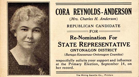 Cora Reynolds-Anderson was the first woman elected in the Michigan House of Representatives. A member of the Ojibwa tribe, Anderson was born in L’Anse in 1882 and attended local public schools.