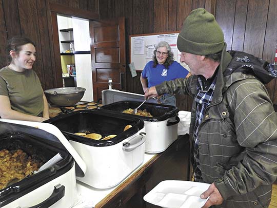 Garrett Neese/Daily Mining Gazette Steve Wercinski of Boston dishes up his plate at the Veterans of Foreign Wars Post 4624 breakfast in Hubbell Saturday as Quartermaster Judy Chizek and Air Force ROTC cADET 1ST Lt. Ally Noles look on.
