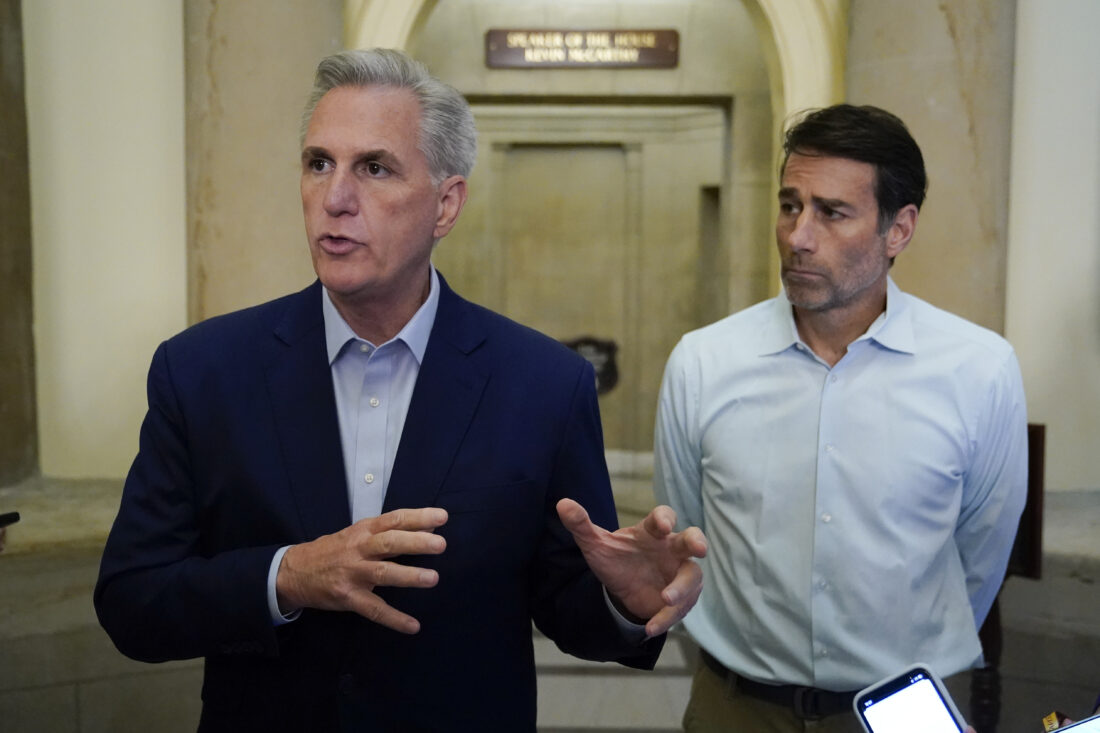 Speaker of the House Kevin McCarthy, R-Calif., speaks with members of the press after participating in a phone call on the debt ceiling with President Joe Biden, Sunday, May 21, 2023, on Capitol Hill in Washington. Standing with McCarthy is Rep. Garret Graves, R-La., McCarthy's top mediator in the debt limit talks. (AP Photo/Patrick Semansky)
