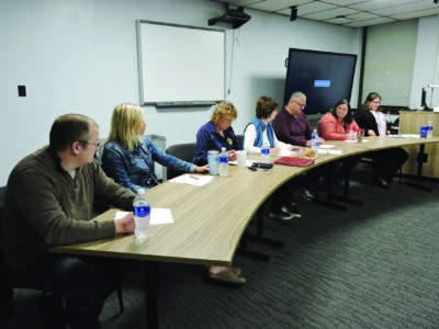 Lake Linden-Hubbell School Board has contracted with the CCISD for temporary superintendent services. Board members (from left): Jeff Dennis, Jennifer Beaudette, Lori Ambuehl, Board President Patricia Burton, David Anderson, Mellisa Corrigan, and Courtney Holzberger discuss the contract. (Graham Jaehnig/Daily Mining Gazette)