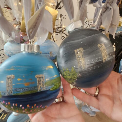Bobbi Shirey displays Christmas ornaments, featuring the Portage Lake Lift Bridge, at her art studio in Calumet.