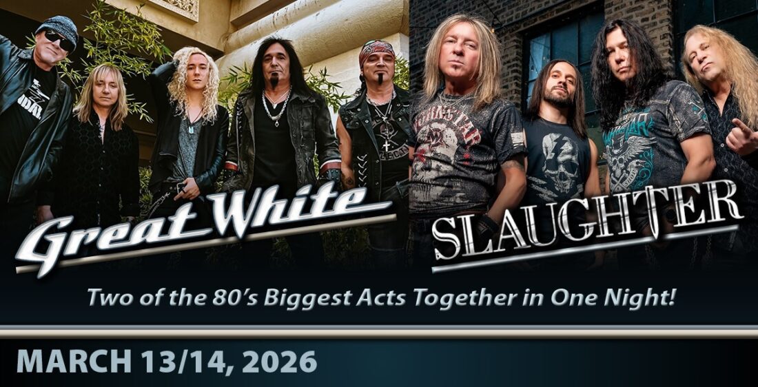 HARRIS — Island Resort & Casino has announced a high-voltage double-headliner rock weekend featuring Great White and Slaughter, two of the 1980’s biggest acts–each known for their unmistakable sound, electrifying live shows, and loyal global fanbases.