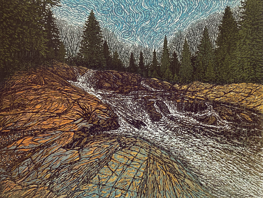 His intricate works, inspired by the region’s natural landscapes, are created through the delicate and demanding reduction printmaking process. Each piece reflects not only artistic vision but also mastery of a complex technique that requires precision, patience, and a willingness to take risks.