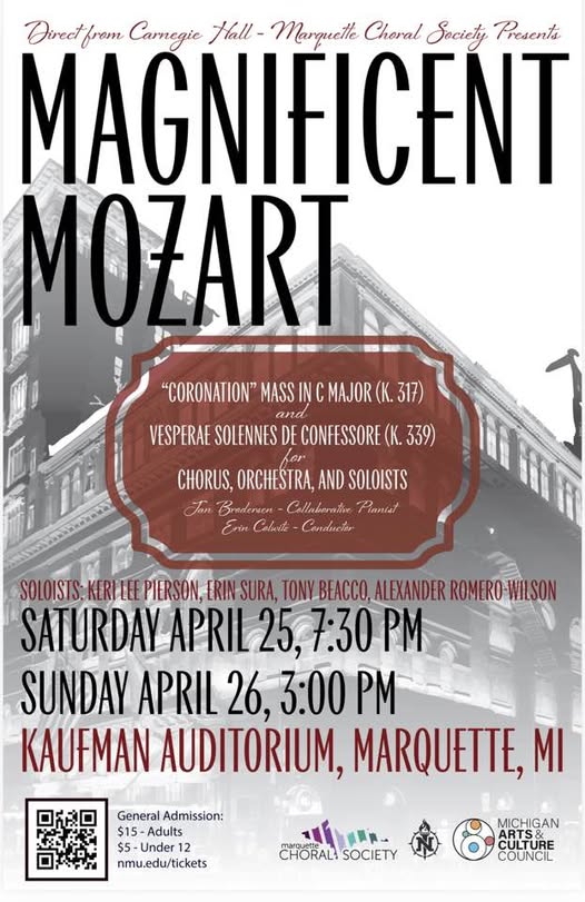 MARQUETTE — Marquette Choral Society will present its Magnificent Mozart concerts at 7:30 p.m., April 25; and 3 p.m., April 26, in Kaufman Auditorium in Marquette.