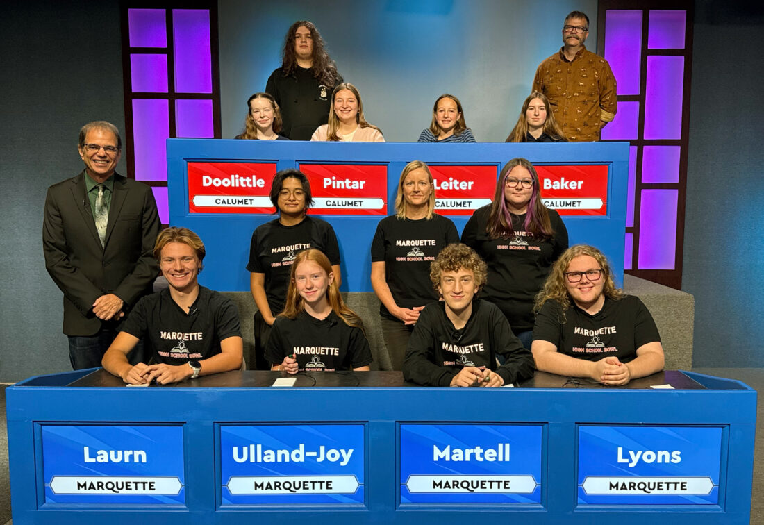 Photo from WNMU TV-13 Calumet High School recently competed against Marquette High School, in WNMU' s High School Bowl. Representing Calumet, seated from left, are players Emelea Doolittle, Laci Pintar, team captain Adelyn Leiter, and Naomi Baker. Standing are alternate Christian Brewer and coach David Torola. Players for Marquette are, seated from left, Nick Lyons, Ethan Martell, team captain Esme Ulland-Joy, and Caden Laurn. Standing are alternates Lorelai Williams and Margarita Villarello with coach Krystyna Rickauer. High School Bowl host Jim Koski is standing at lower left.