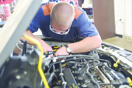 Michigan Department of Corrections photo. A Michigan prison inmate in the automotive technology program works on a car engine.