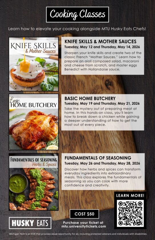 Final course details, including appropriate attire and parking information, will be emailed to participants after registration. For additional questions, contact huskyeats@mtu.edu or call 906-487-1861 during business hours.