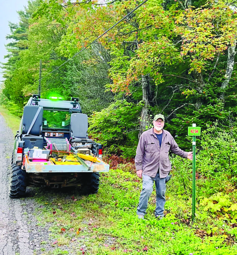 Photo courtesy of Keweenaw County Sheriff Curt Pennala Joe Schneller stands next to one of the new emergency response trail markers in Keweenaw County. The new marker replaces one of more than 80 that were stolen, broken or vandalized.