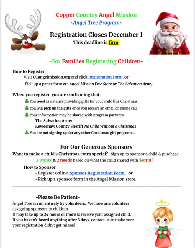 CALUMET – Registration for the Copper Country Angel Mission’s Angel Tree Program closes on Monday. This registration is for those needing assistance providing gifts for their children this Christmas. Renee Tuoriniemi, Angel Mission volunteer, said that Monday is the absolute deadline for registration, because the Mission needs time to match families with a sponsor.