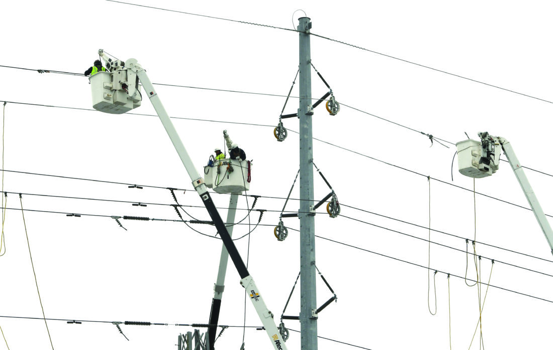 ITC Transmission, a subsidiary of DTE Energy, basket trucks work on power lines along 8 Mile, near Wanda in Ferndale, Mich. on Saturday, Feb. 25, 2023. (Daniel Mears/Detroit News via AP)