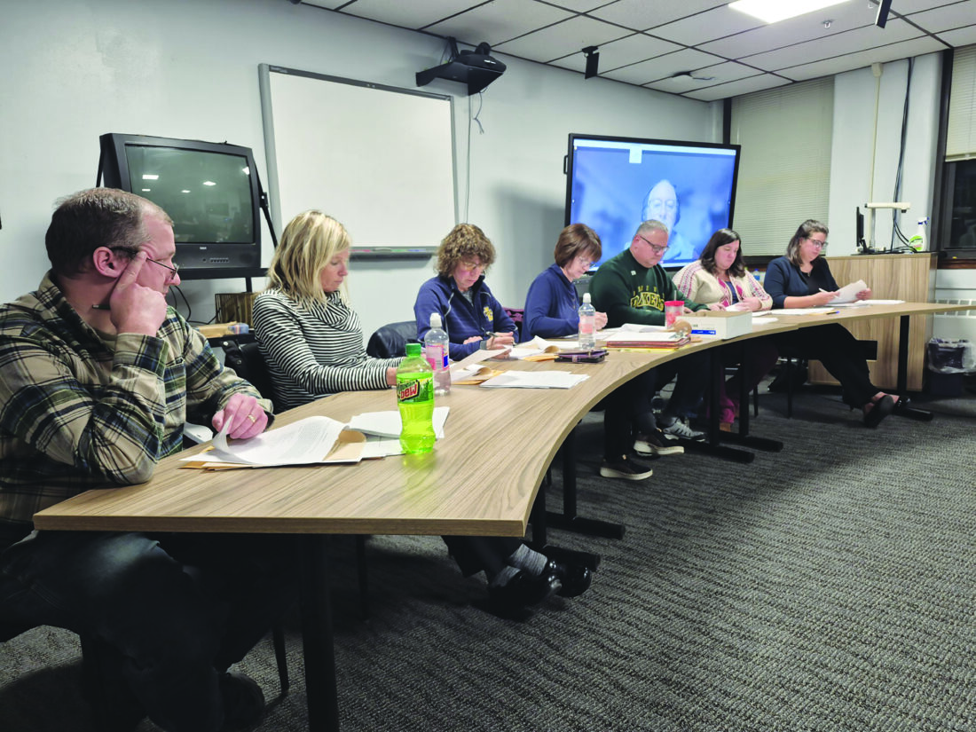 Graham Jaehnig/Daily Mining Gazette Lake Linden’s School Board discusses job postings at Monday’s regular meeting. Board members (from left): Jeff Dennis, Jennifer Beaudette, Lori Ambuehl, Board President Patricia Burton, David Anderson, Mellisa Corrigan, and Courtney Holzberger discuss the contract.