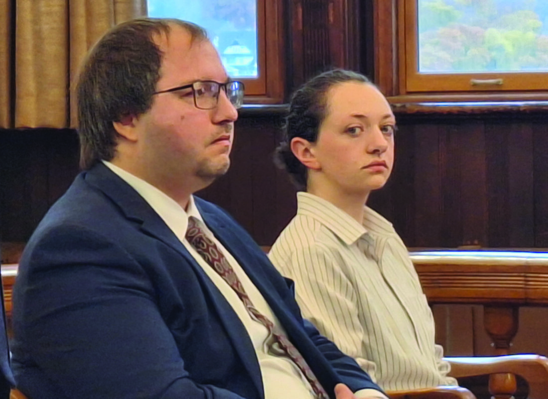 Ben Grabacz/Daily Mining Gazette Avery Lawrence (right) sits besides her attorney, Joshua Makkonen as she was sentenced to 12 months probation and 15 days of community service for stealing 900 small American flags from the Young Americans for Freedom's 9/11 memorial at Michigan Tech.