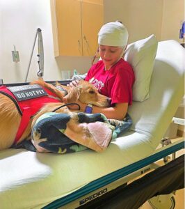 Courtesy photo Vanessa Mabie was diagnosed with functional neurological disorder (FND), a condition that causes seizures, tremors, weakness and more. Annie, Mabie's golden retriever, comforts her while Mabie undergoes testing at the University of Michigan's C.S. Mott Children's Hospital.