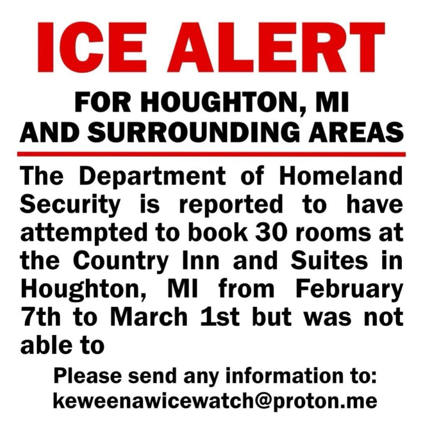 “Ice agents are allegedly in Houghton attempting to book rooms. Go out and get a whistle!! If you see them, blow it, take out your cameras document them do not attempt to get in the way at all but definitely let them know your watching and recording them!!! Be safe out there.”