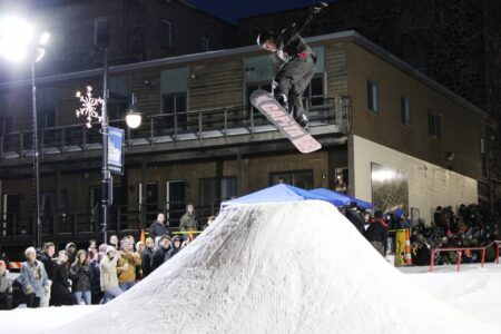 HOUGHTON – Spectators lined the sides of Huron Street and packed in along the waterfront in downtown Houghton Saturday evening to see snowboarders freestyle their way through a custom-built urban course. Cheers from the crowd erupted when boarders landed tricks, often drowning out the thumping music from the Red Bull party car.