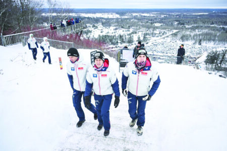 Skiers made the most of the delays Saturday, gathering for team photos on the end of the slide and chatting with volunteers at the top of the hill. On Sunday, the Kiwanis Ski Club tried to put together a small, cash “bump jump” competition on a small makeshift jump, the sort on which children would learn, but even that had to be scrapped after about a half hour of trying. So more than four dozen jumpers, coaches and trainers headed back to Europe with nothing to show for their efforts.