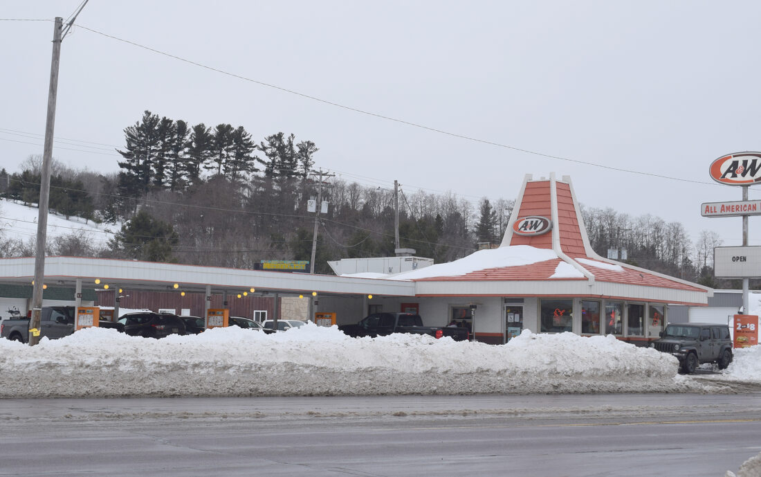 Marguerite Lanthier/Daily News Tall piles of plowed snow line the road in front of A&W Restaurant along Stephenson Avenue on Iron Mountain's north side. The restaurant opened for the season Saturday but was closed Sunday and Monday due to the snowstorm.