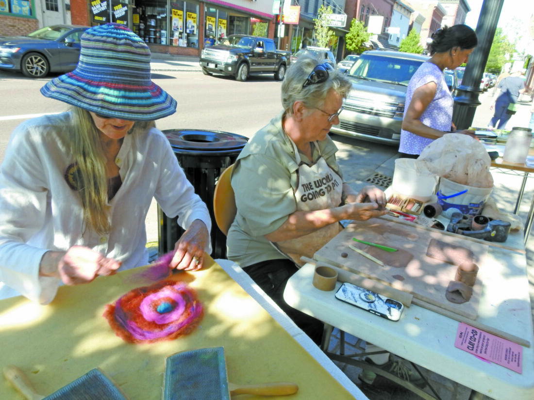 Outside the Copper Country Community Arts Center, artists set up tables outside to demonstrate arts such as clay and watercolor painting. Phyllis Fredendall made a series of concentric circles through needle felting.