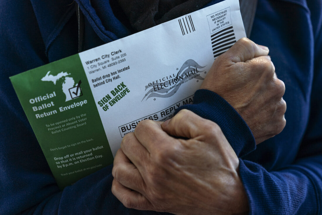 A Michigan voter clutches her absentee ballot before dropping it off at the city clerk's office in Warren, Mich., on Oct. 28, 2020. A total of 1.6 million people have requested absentee ballots so far this year, surpassing the 1.16 million who chose the option in the 2018 midterm election. (AP Photo/David Goldman, File)