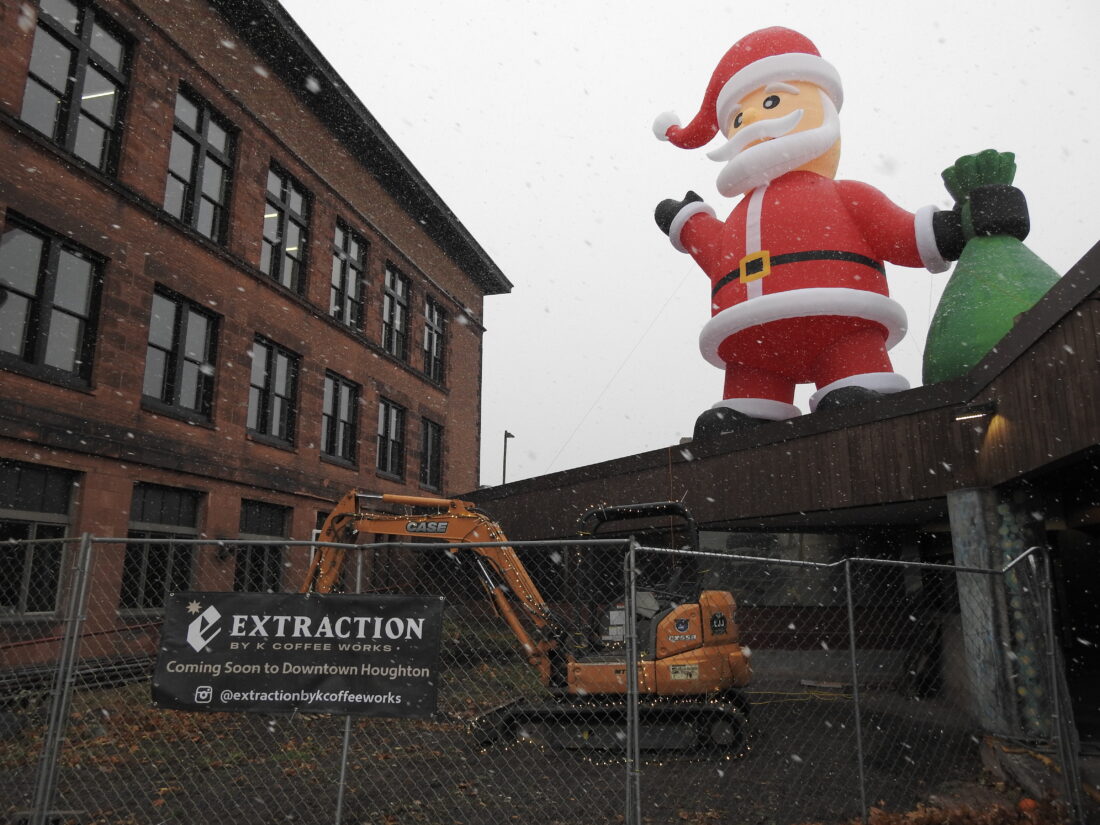 Garrett Neese/Daily Mining Gazette Construction equipment and Christmas decorations are seen in front of 326 Shelden Ave. Friday, the day after a Houghton County Circuit Court decision partially lifted a stay on site plan approval for the location, which had blocked construction since October.
