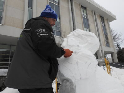 “I thought with the workload our students have, and the sheer scale of the statues they’re building, it really might be a huge leg up for them to be able to build with the technique that allows them to make these really beautiful finishes, using less snow, and being a little bit easier on the arms to cut through,” he said. “I thought who better to teach it than a two-year reigning national champion?”