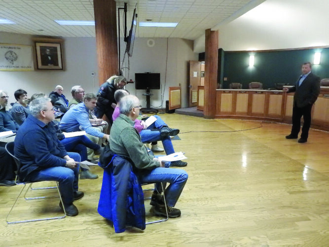 Houghton City Manager Eric Waara addresses an audience including representatives from the city, county and local schools about the potential ramifications of reduced property tax revenue from Walmart on Razorback Drive Thursday.