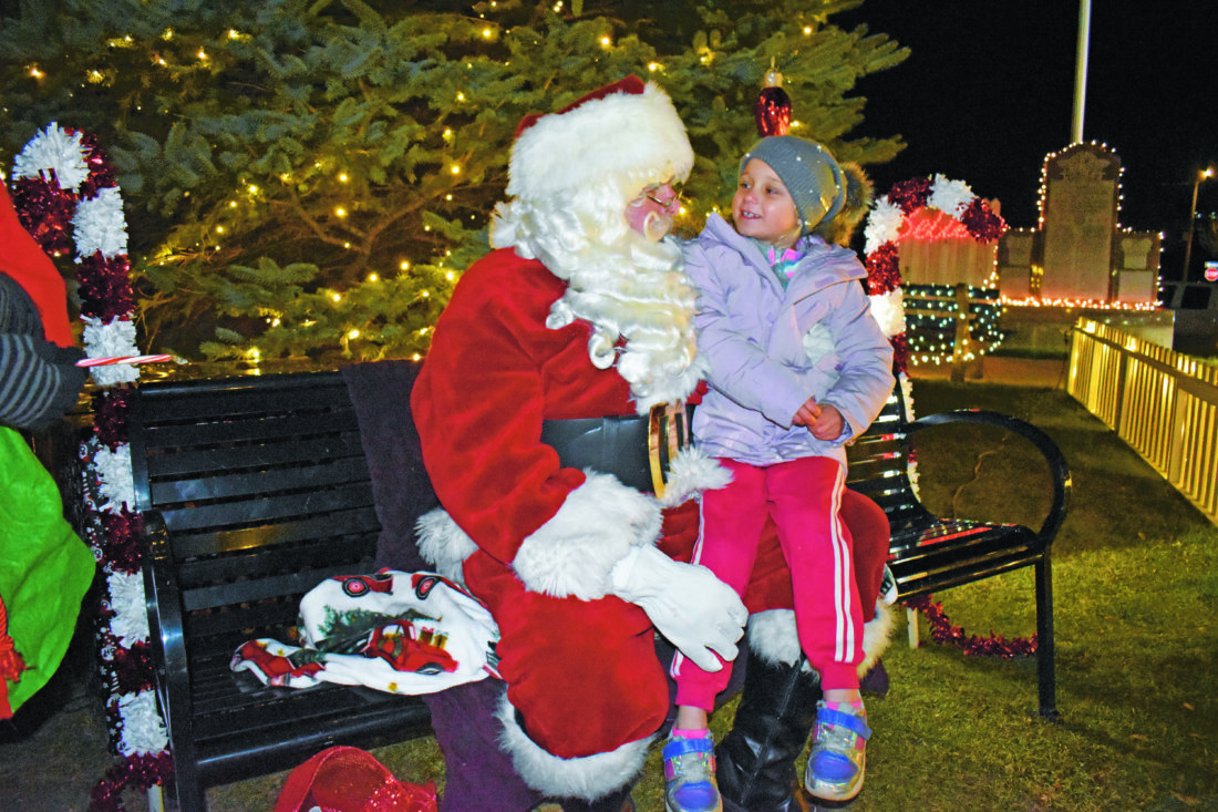 After Santa Claus presided over the lighting of the tree in Veterans Park, he sat down on a bench to meet with a line of kids that stretched down Quincy Street.