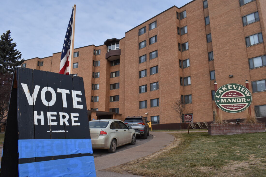 Garrett Neese/Daily Mining Gazette A voting sign is seen outside Lakeview Manor in Hancock Tuesday. This was the first election with Lakeview as the combined site for Hancock voters; sign-in and voting booths were separated inside by precinct.