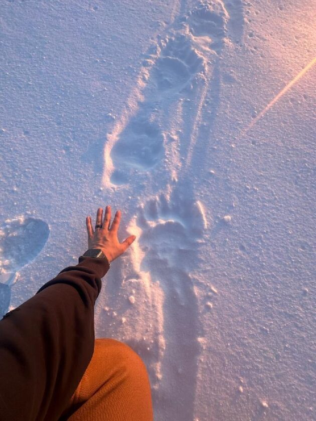 A human hand to polar bear pawprint comparison.