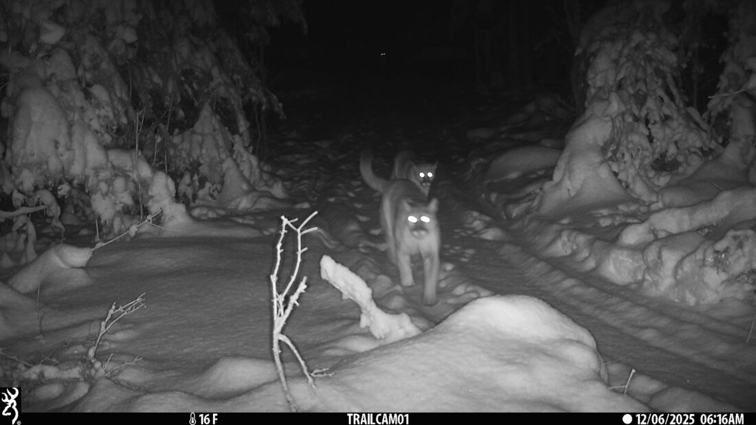 DNR photo Three cougars: An adult cougar walks down a trail in the Upper Peninsula followed by two cougar cubs on Dec. 6, 2025. The DNR verified this photo from a private trail camera by enhancing the image to verify the existence of the three cougars, including the cub bringing up the rear. (Photo courtesy of private landowner)