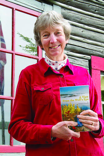 Carolyn “Candy” Peterson poses in front of the Bangsund Cabin on Isle Royale with a book she authored “A View From the Wolf’s Eye.”